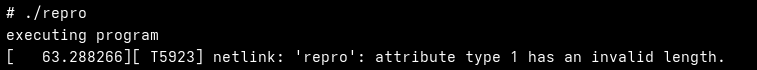 [ 200.607971][ T5893] netlink: 'repro': attribute type 1 has an invalid length.References